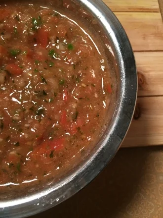 As the tortillas are baking, add the tomatoes, onion, garlic, jalapeno, and cilantro to a food processor or blender.